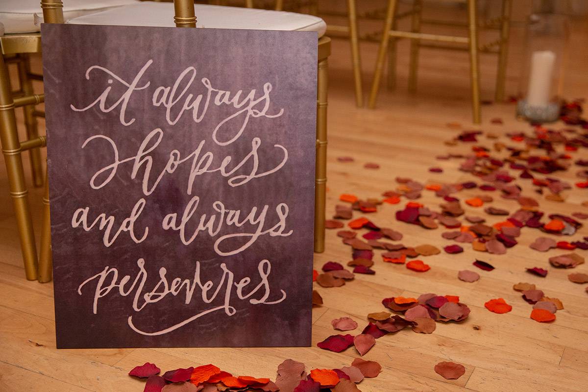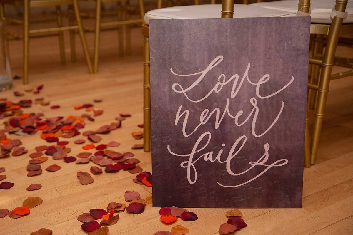 - “Love is patient” signs (does not include silk leaves down the aisle or the runner)