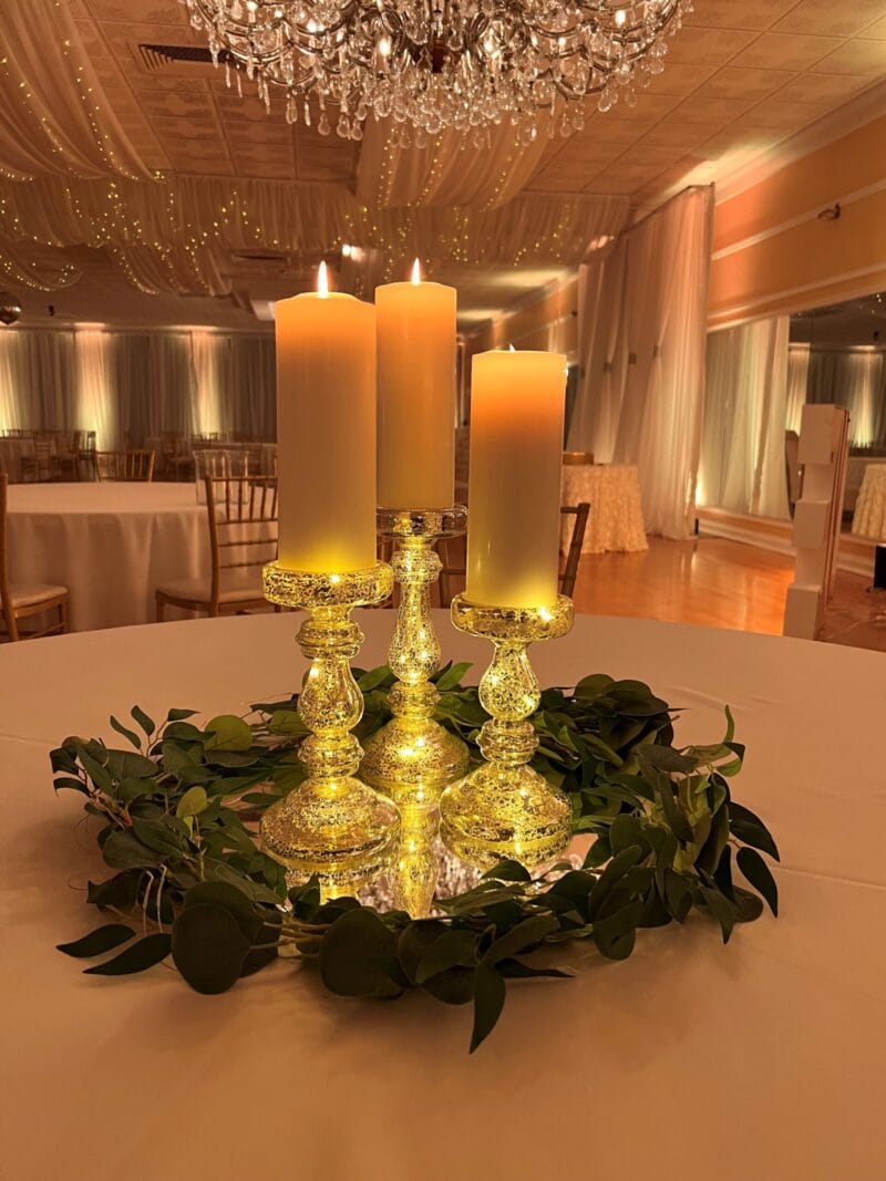 This centerpiece comes with 3 different height gold mercury candle holders, LED candles, mirror and silk eucalyptus garland.