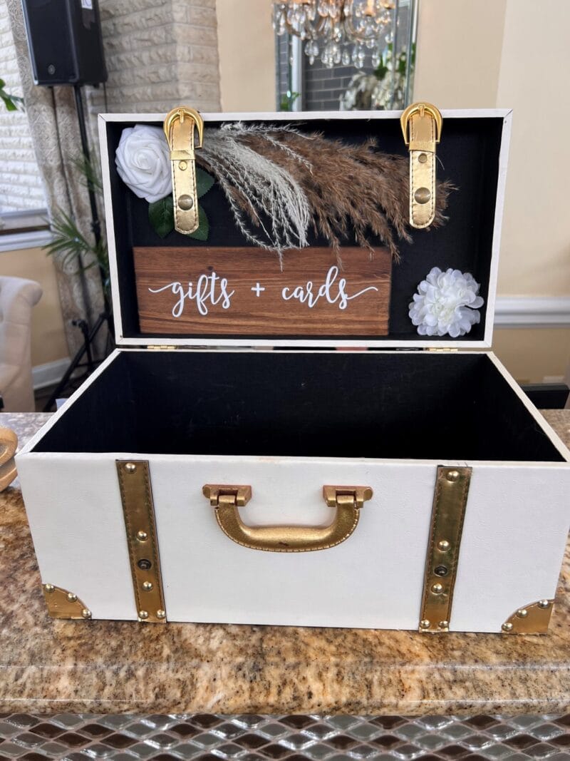 This adorable suitcase comes with Boho chic flowers and wooden “gifts & cards” sign